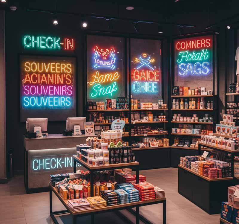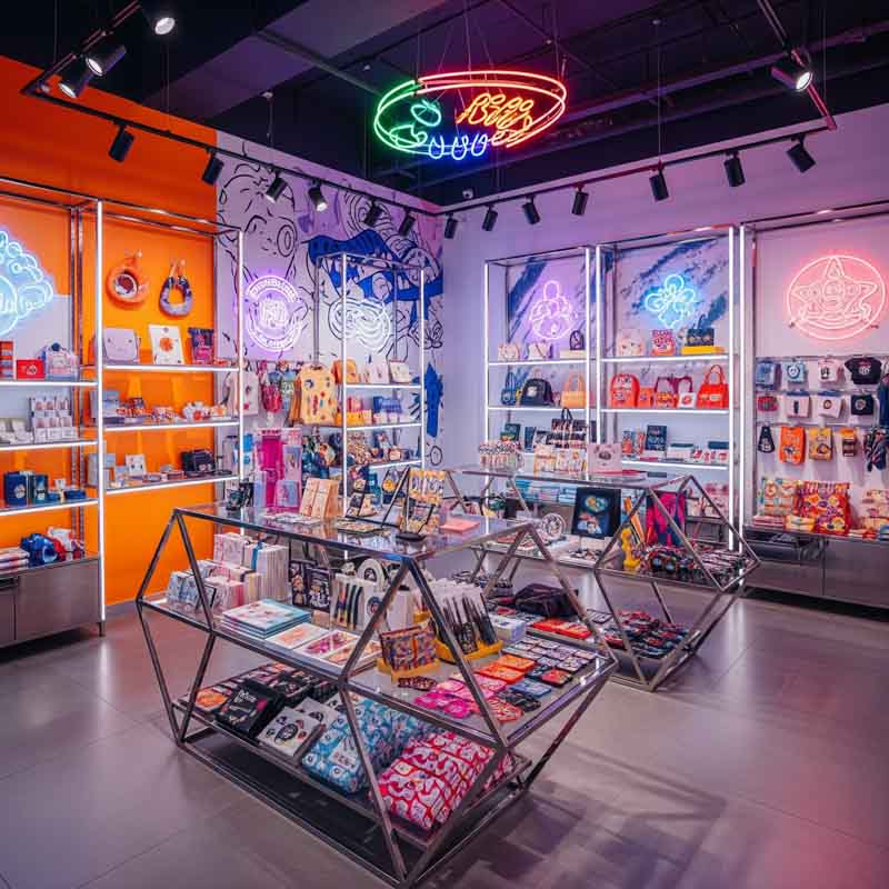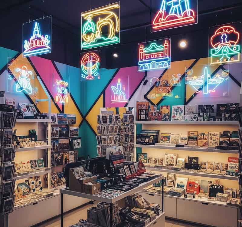 Không gian cửa hàng quà lưu niệm rực rỡ sắc màu với các kệ trưng bày sáng tạo và ánh sáng neon, mang lại cảm giác năng động, tươi mới và mời gọi khách hàng khám phá.