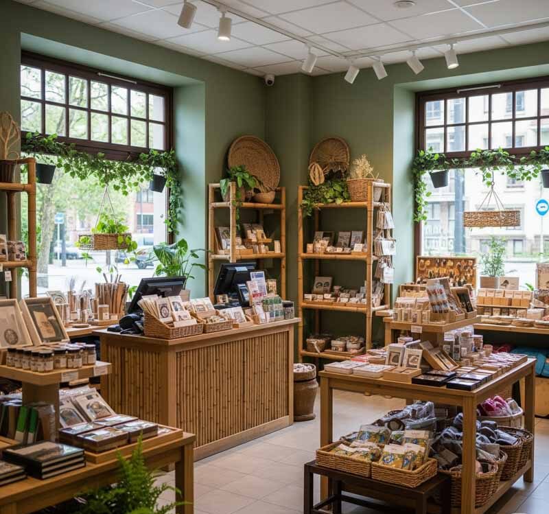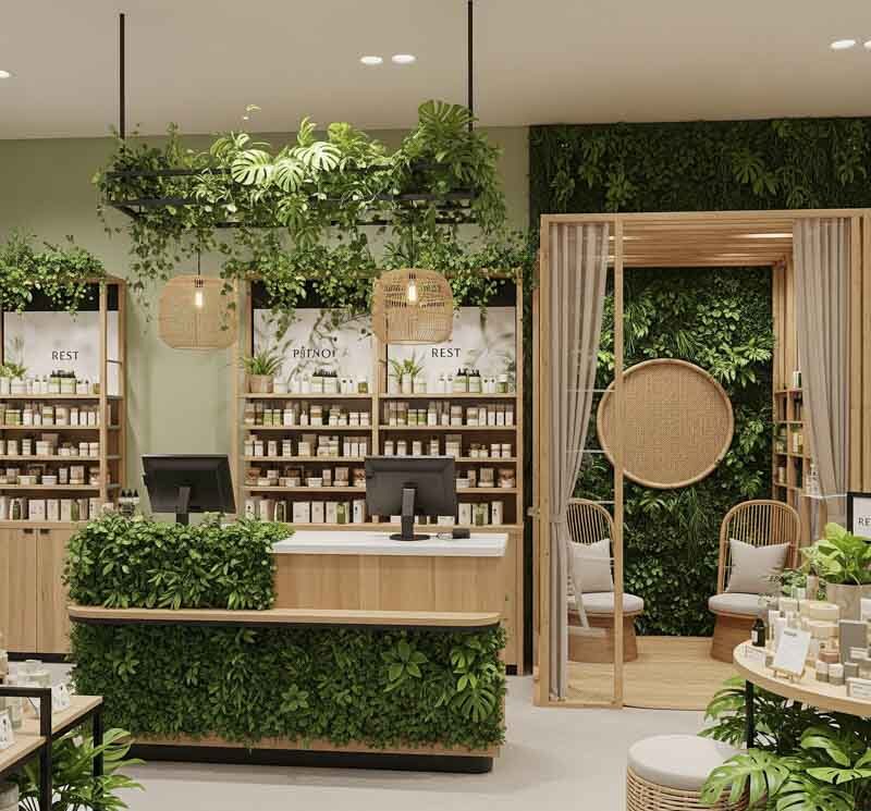 Cây xanh giúp tạo sự thư giãn và gần gũi trong không gian. Có thể bố trí ở quầy thu ngân, kệ trưng bày hoặc góc nghỉ chân. Kết hợp vật liệu thiên nhiên như gỗ, mây, tre càng tăng tính thẩm mỹ. Mảng xanh phù hợp xu hướng sống xanh và tạo thiện cảm với khách hàng.