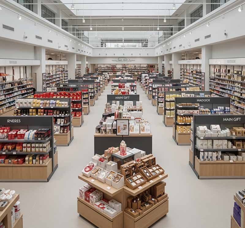 Không gian cần mở, dễ di chuyển và dễ tìm sản phẩm. Nhóm các loại quà theo chủ đề hoặc dịp lễ sẽ giúp khách dễ lựa chọn. Sản phẩm chủ lực nên đặt ở vị trí trung tâm hoặc nổi bật nhất. Tránh sắp xếp quá dày gây bí bách và khó trải nghiệm.