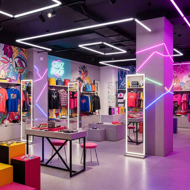 Đèn neon mang đến ánh sáng nghệ thuật và cá tính. Thích hợp với cửa hàng nhắm đến giới trẻ và phong cách hiện đại. Nên dùng ở bảng hiệu, slogan hoặc khu check-in. Cần sử dụng hợp lý để không gây chói hoặc rối mắt.
