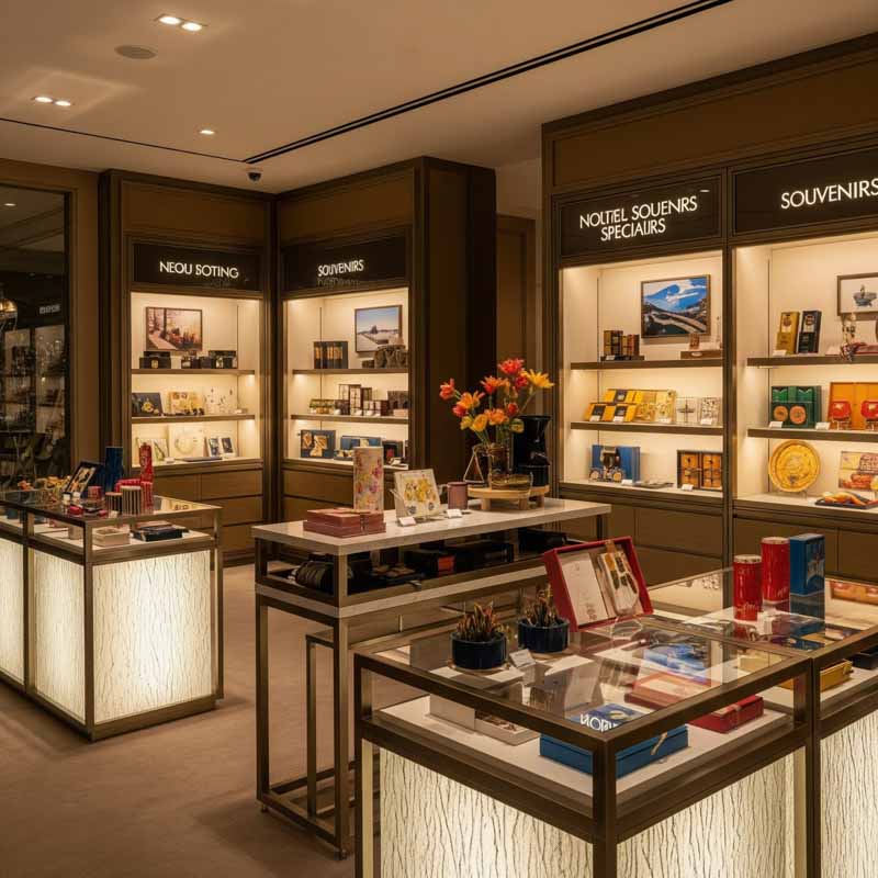 Sử dụng vật liệu cao cấp, bố trí sang trọng, ánh sáng đẳng cấp. Phù hợp quà lưu niệm cao cấp hoặc đặc sản vùng miền cho khách quốc tế.