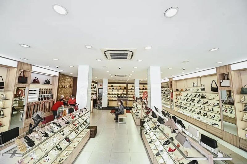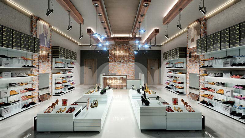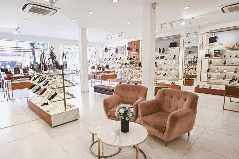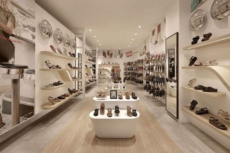 Bố cục không gian nên thông thoáng, dễ di chuyển và phân khu rõ ràng giữa các dòng sản phẩm. Dù diện tích lớn hay nhỏ, thiết kế shop giày dép cần tối ưu hóa từng mét vuông.