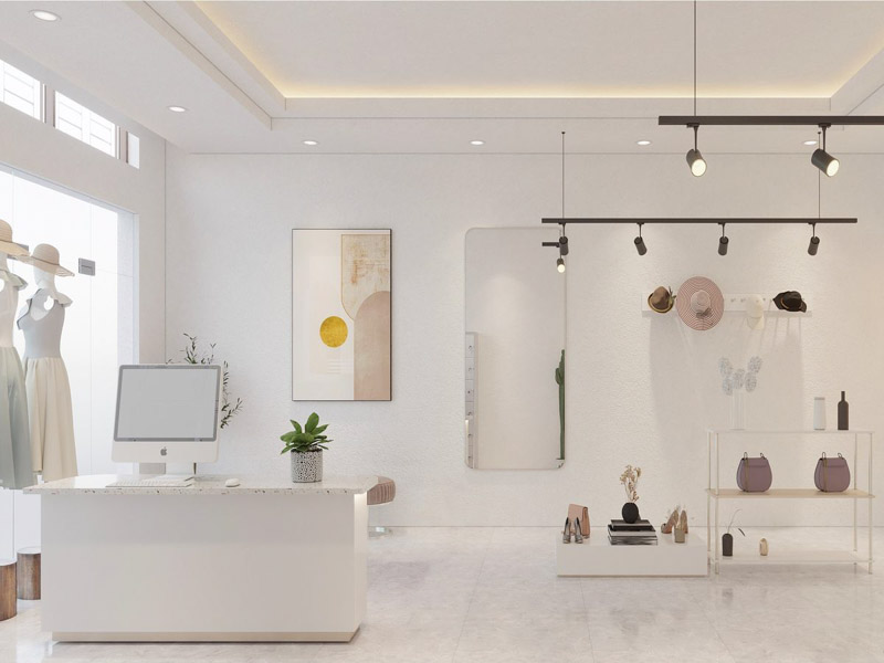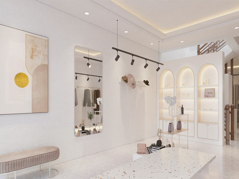Trong thiết kế shop thời trang, ánh sáng và màu sắc không chỉ phục vụ thẩm mỹ, mà còn ảnh hưởng đến tâm trạng của khách hàng khi mua hàng. Đối với những shop có không gian nhỏ nên tận dụng ánh sáng tự nhiên mang lại cảm giác thoải mái, không gian thông thoáng hơn. Nếu shop bạn có vị trí mặt tiền thoáng, hãy tận dụng cửa kính lớn hoặc giếng trời để đưa ánh sáng tự nhiên vào không gian.Lựa màu sắc dựa trên phong cách thương hiệu
